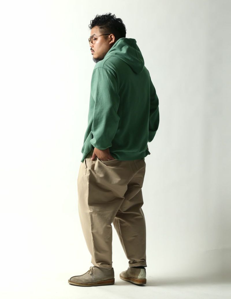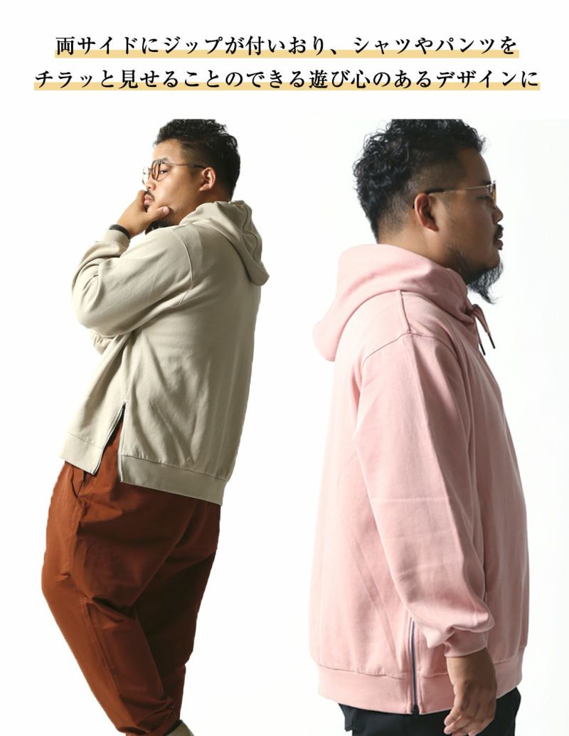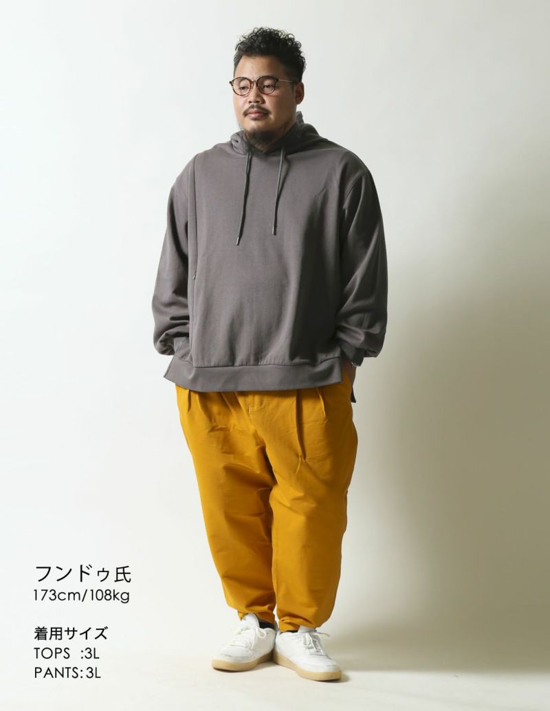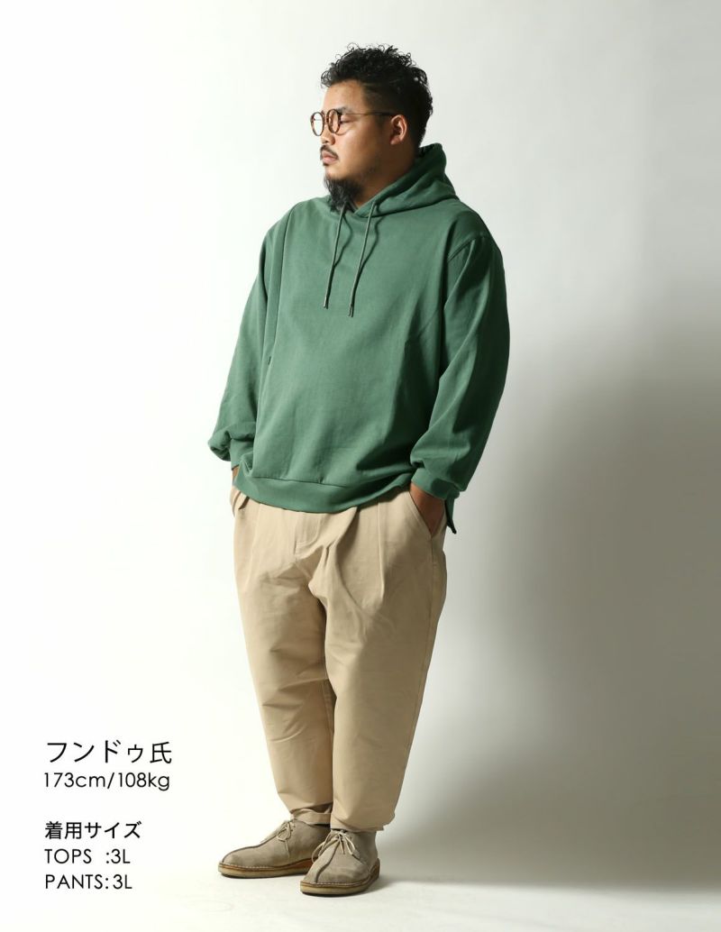 僕は166/112のチビデブで普段は3L〜4Lの服をメインで着ていますが、このパーカーは他メーカーと比べてサイズが大きく自分は2Lがピッタリ(パツパツでは無い)でした。