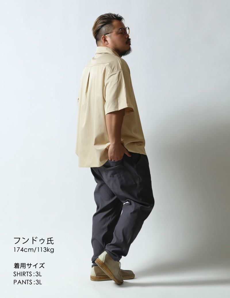 生地は艶がありキレイめながらもシルエットはゆったりでカジュアルに楽しめます。